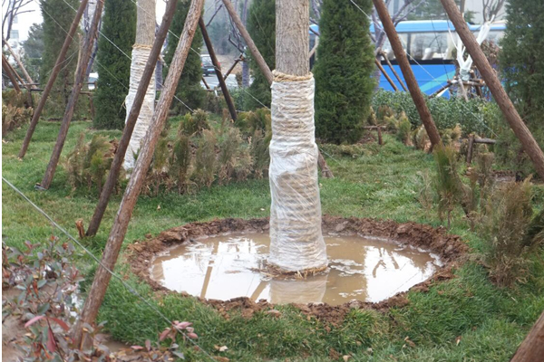 冬季苗木易干旱,為了防止因缺水而干枯,項(xiàng)目部人員首先對其灌溉凍水保持苗木自身的水分,另外,進(jìn)入冬季,早晚和中午的溫差較大,項(xiàng)目部人員給苗木的根部以上半腰位置涂上一定比例的白灰(白灰反射陽光,減少溫差),以有效減少苗木病蟲害和防止樹皮凍裂。