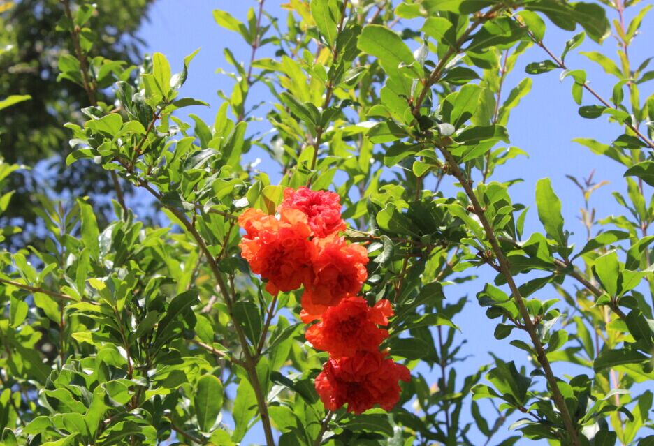 石榴的樹姿美觀,花色鮮艷漂亮,花期長,果實(shí)鮮紅,常在一棵樹上花果并存,且果實(shí)在枝上可觀賞的時(shí)間也長,可賞、可食,味甘酸相和,有“天下之奇樹,九洲之名果”的美譽(yù)。
