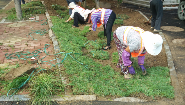 苗木栽植完成后鋪種草皮(主要為早熟禾,馬尼拉及結(jié)縷草根據(jù)現(xiàn)場不同的位置及條件)